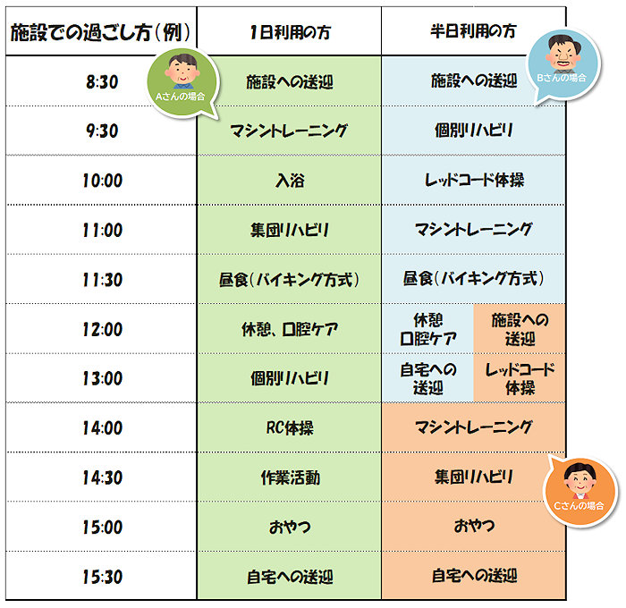 定期的な評価を基に理学療法士等による個別のリハビリテーションの実施や、日常生活動作(入浴・排泄・食事など)を連動させた訓練をお一人お一人の目標を設定して計画的に行います。